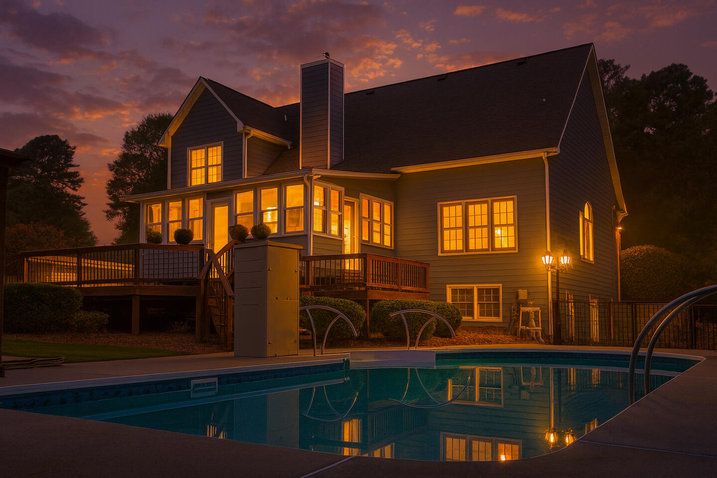 AI relights daytime exteriors with realistic golden-hour sky, window glow, and reflections—capturing “twilight magic” without return visits.