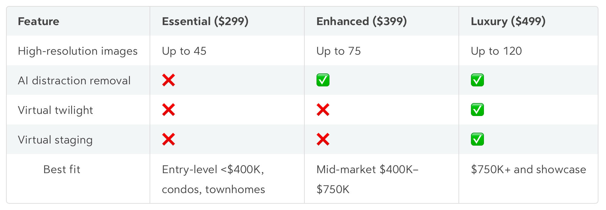 MLS-ready photography, delivered next day—every package includes full interior & exterior coverage, drone aerials, and polished high-resolution editing.