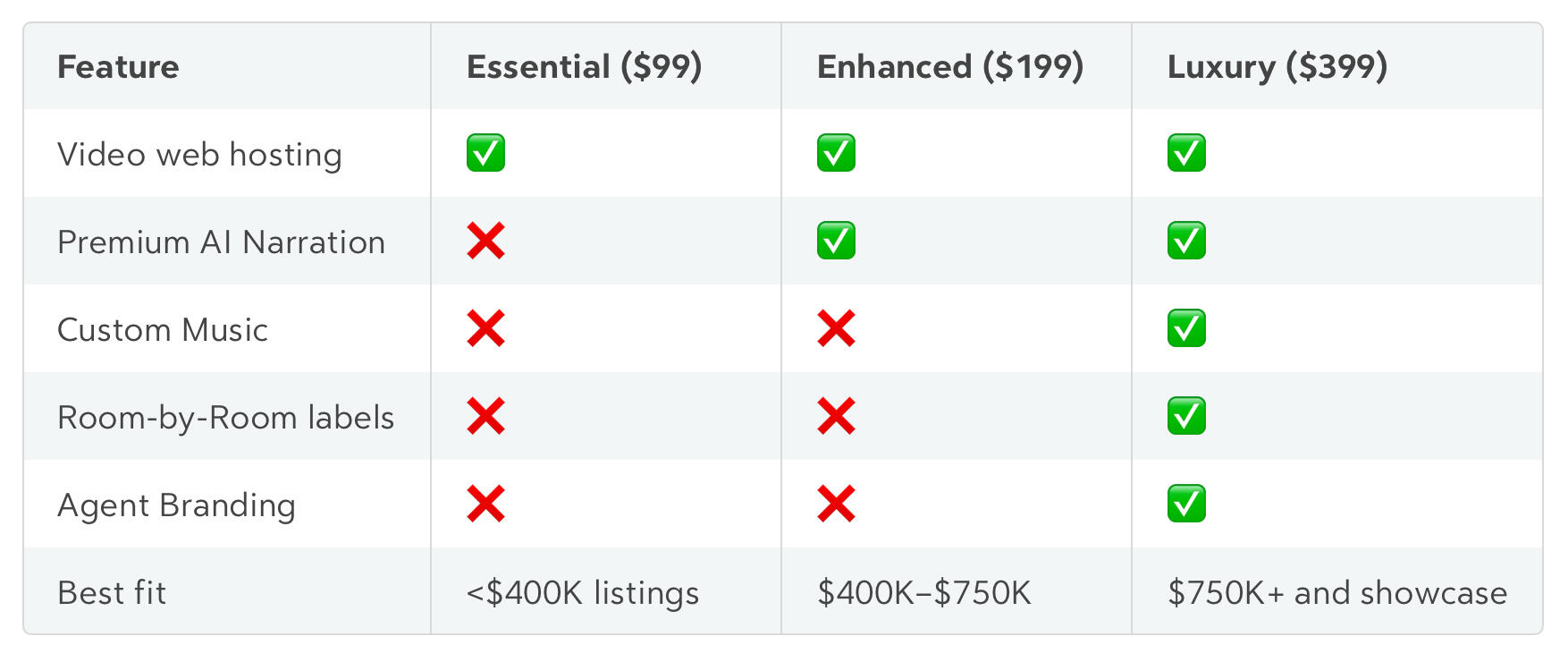 AI turns your photo set into a smooth, cinematic walkthrough—smart pans/zooms, scene ordering, and branded titles—so you get video without a second shoot.